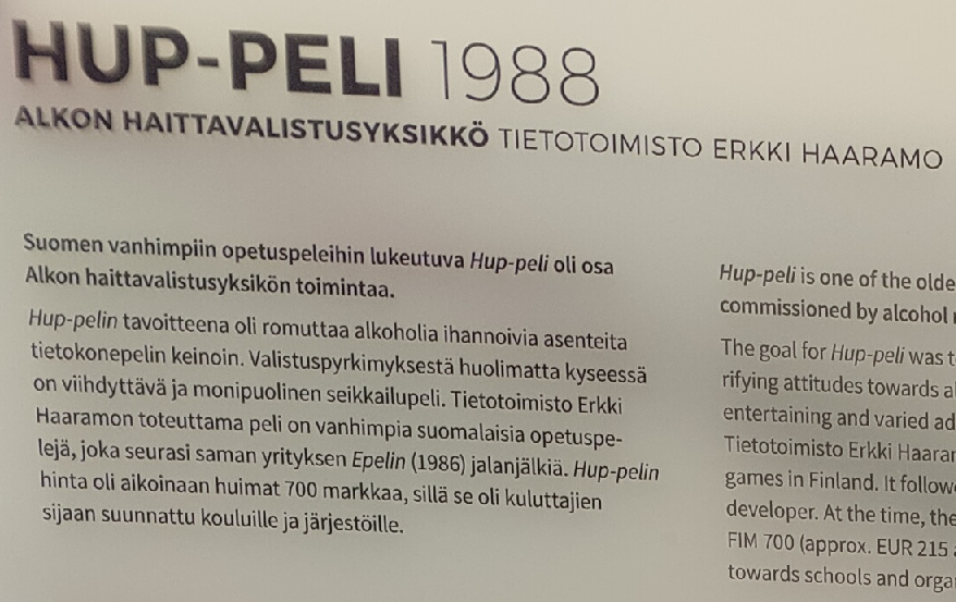 Pelimuseossa oli mainittu tuo Hup-peli, mutta vuosi on eri ja se oli merkittyi Erkki Haaramolle, joka taas on tehnyt tuollaisen Promillepelin myöhemmin. https://suomigamehub.com/pelit/promille/